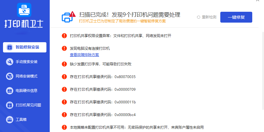 打印机卫士,打印机驱动安装修复、一键解决打印机驱动问题和脱机问题 安装修复成功率96%,官方驱动高速下载,一键智能安装修复。